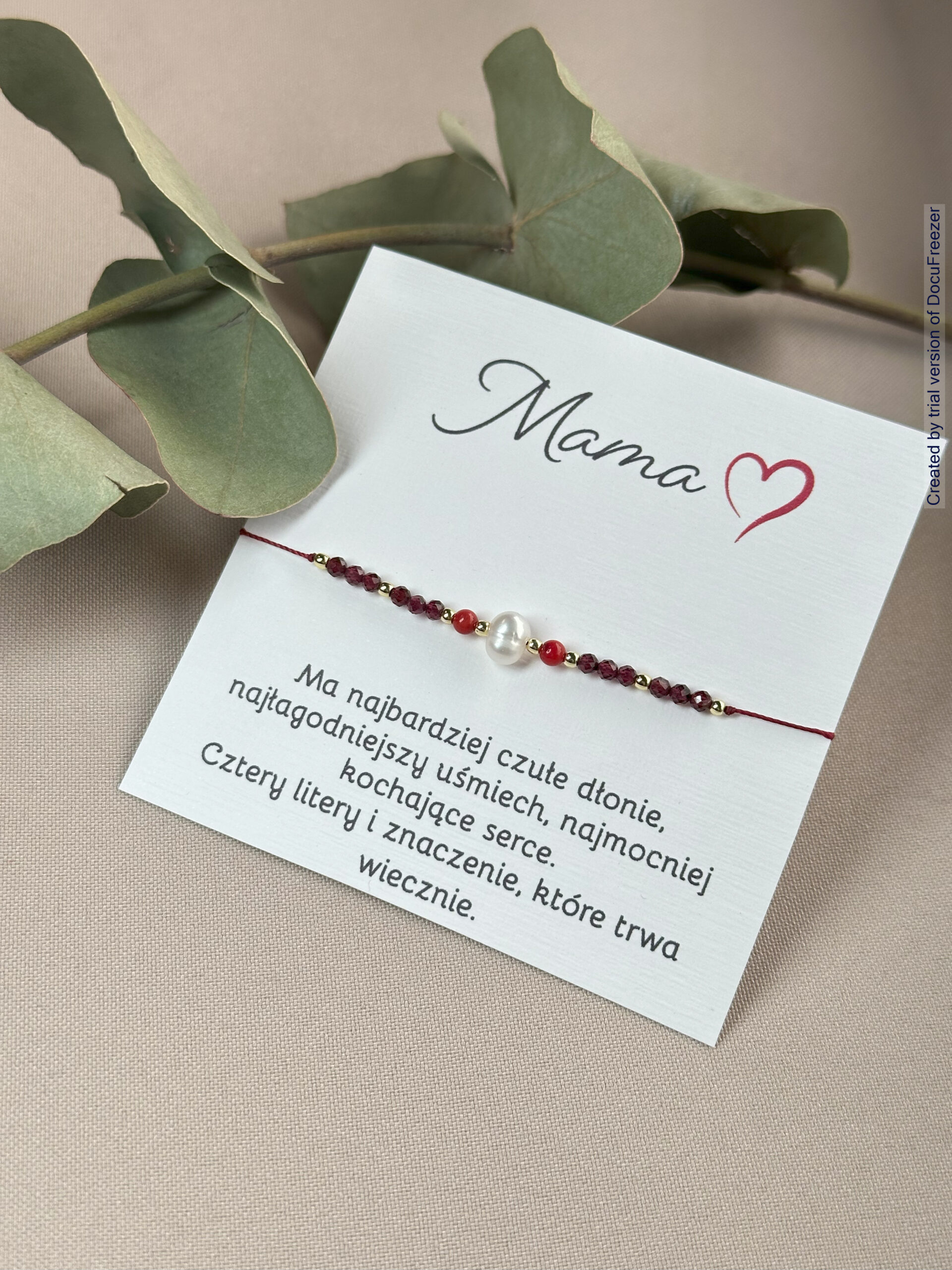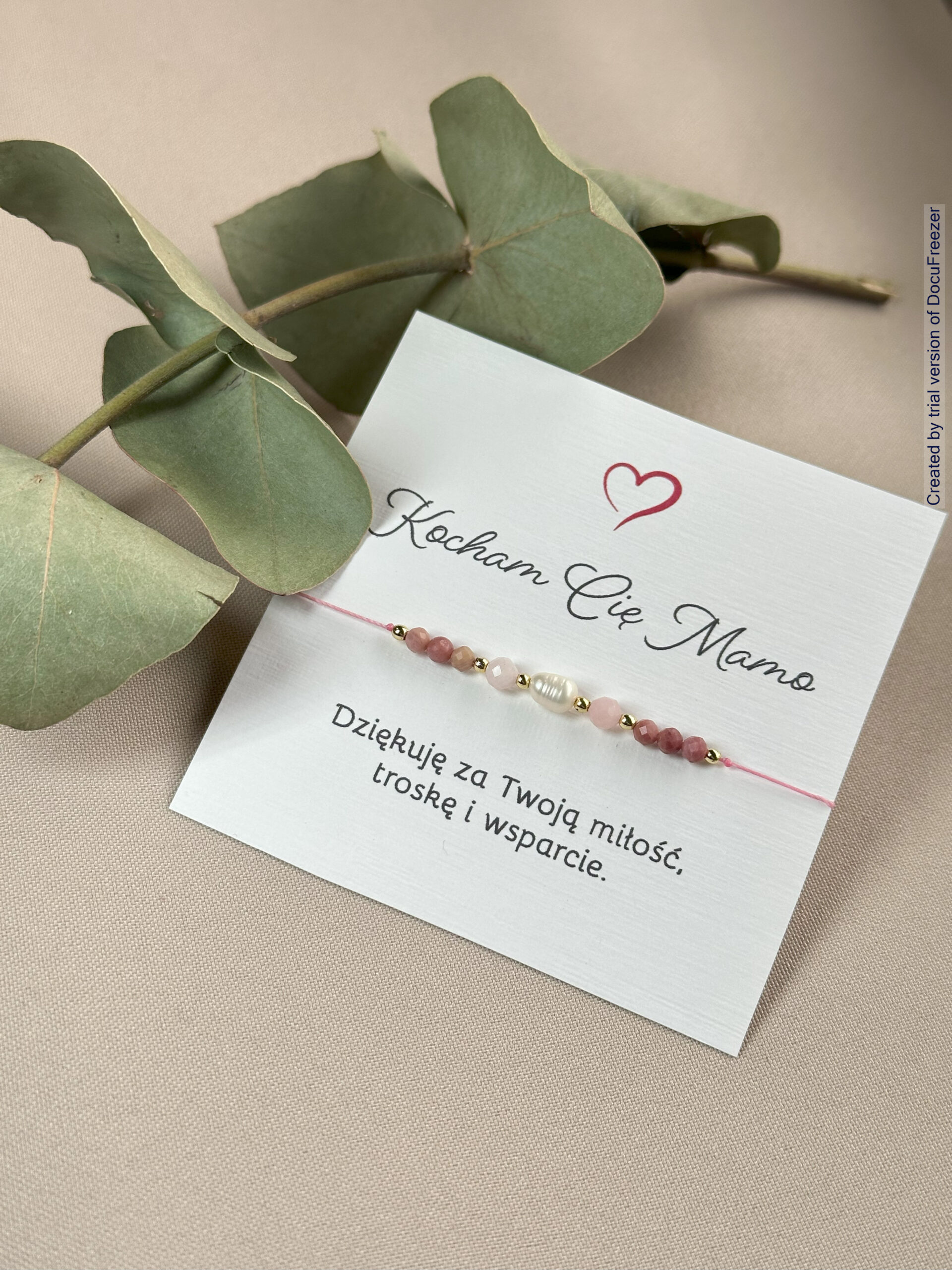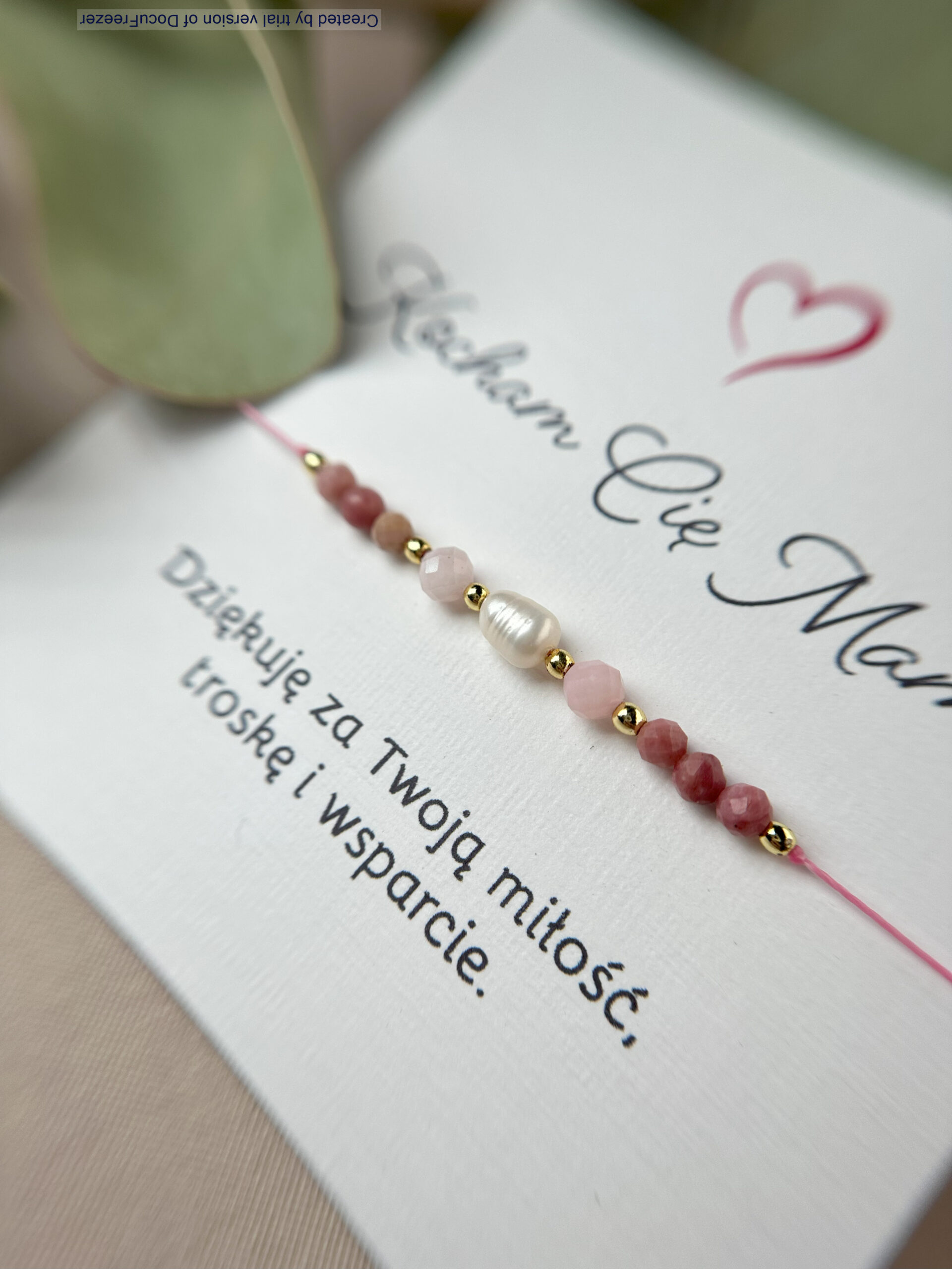 Ręcznie wykonana bransoletka z naturalnych kamieni to wyjątkowy prezent dla mamy – delikatna, symboliczna i pełna kobiecej energii. Połączenie rodonitu i kwarcu różowego – kamieni kojarzonych z miłością, spokojem i troską – z klasyczną perełką oraz złoconym hematytem tworzy elegancką i harmonijną kompozycję. Wszystko nawleczone na solidną, jubilerską nitkę, która zapewnia trwałość i komfort noszenia.
